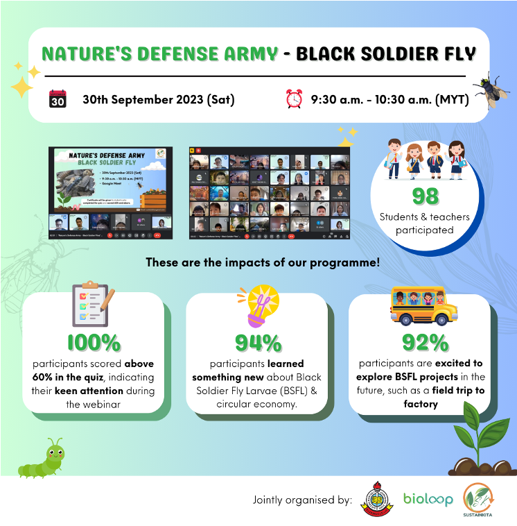 On the 9th of October 2024, SustainKita proudly launched its first environmental education webinar series titled “Nature’s Defense Army – Black Soldier Fly”. The virtual event, held in collaboration with BioLoop Sdn. Bhd., an innovative organic waste management startup based in Teluk Intan, Perak, introduced the remarkable world of the Black Soldier Fly to the students of SJK (C) Foon Yew 2 in Johor Bahru.